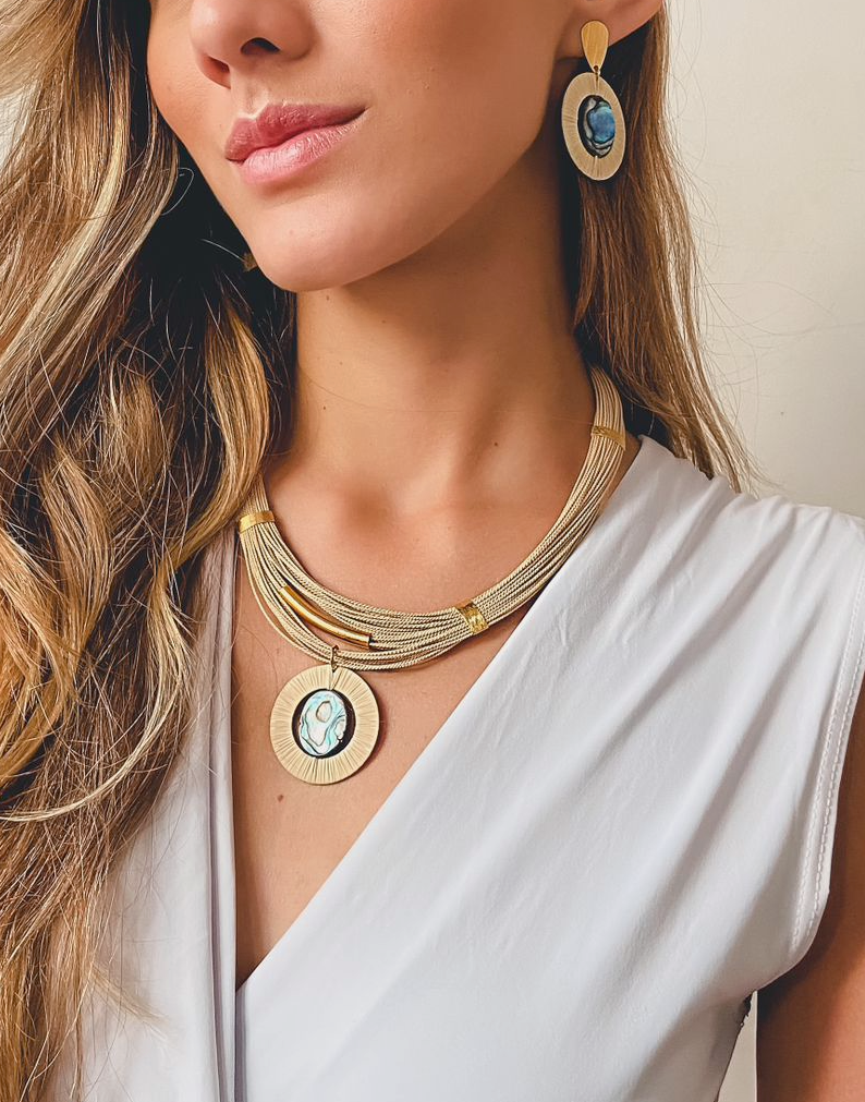 A radiant balance of earth and ocean — the Ismera Earrings feature vibrant abalone cabochons encircled by handwoven Buriti palm fiber in a modern halo design. Grounded in nature, yet luminous in presence.