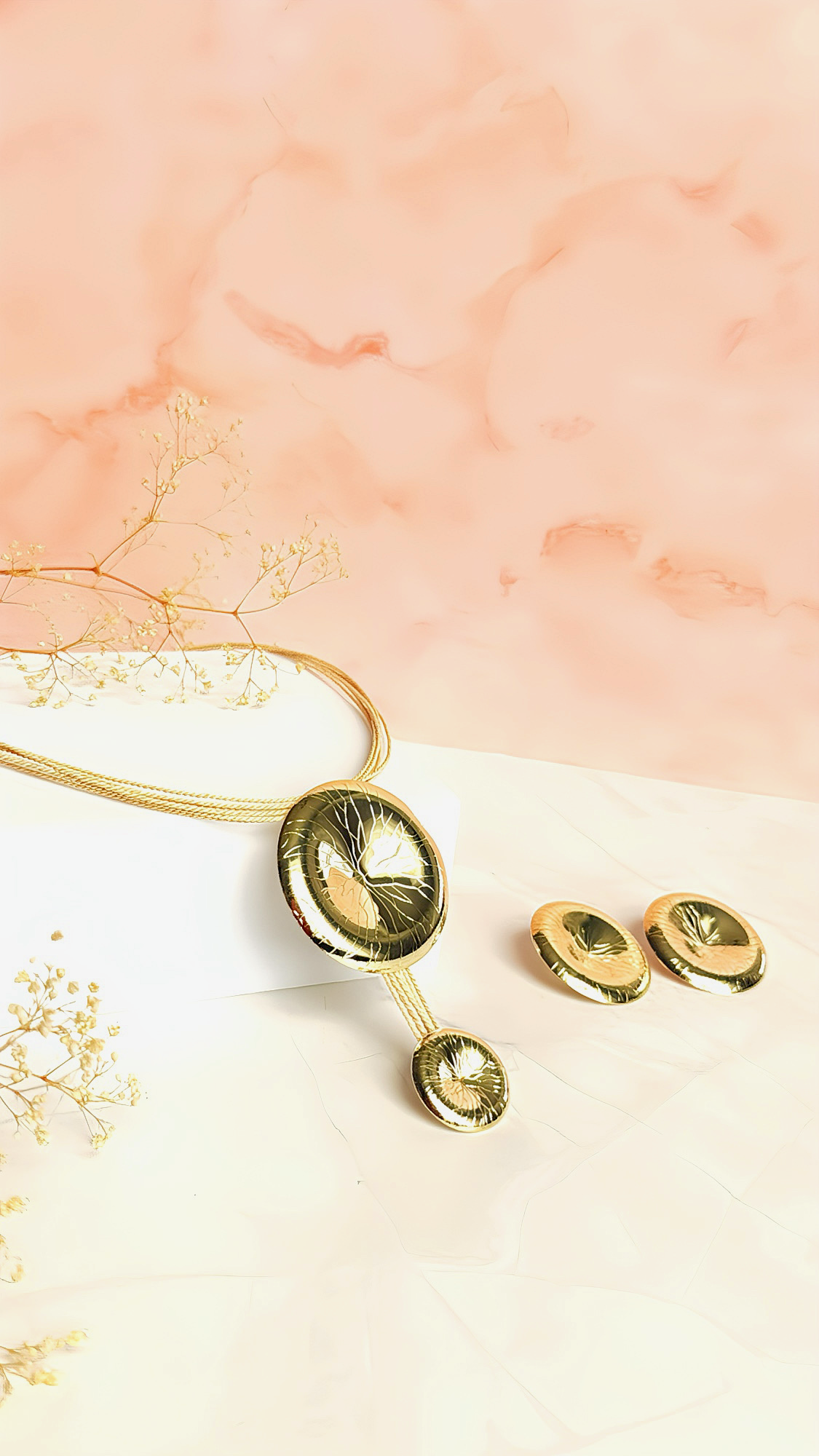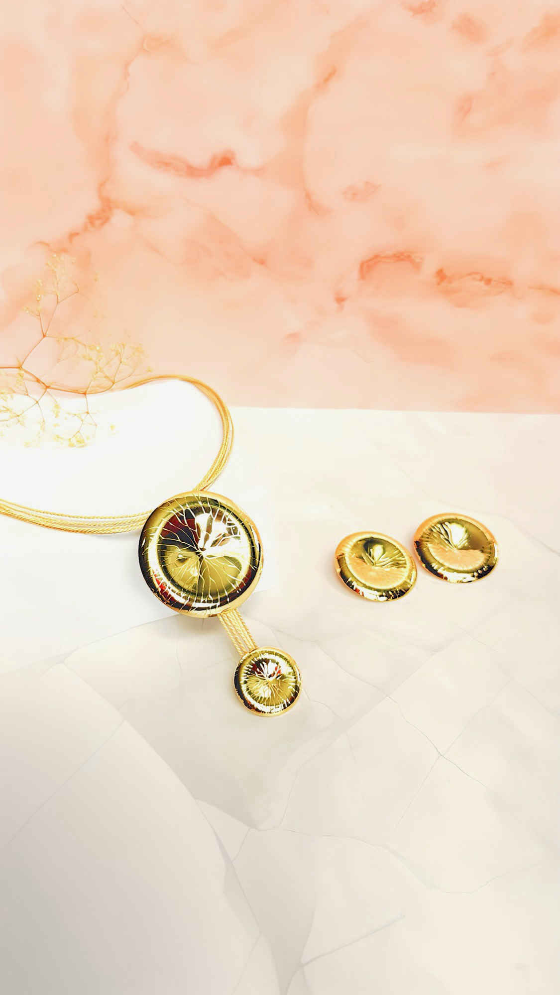 A radiant duo — Aurel combines layered golden medallions with solar bursts of texture and shine. Suspended on smooth strands of handwoven buriti fiber, this sculptural necklace brings warmth and bold elegance to any look. Paired with the matching Aurel Earrings, the set embodies coordinated luminosity and refined statement style.