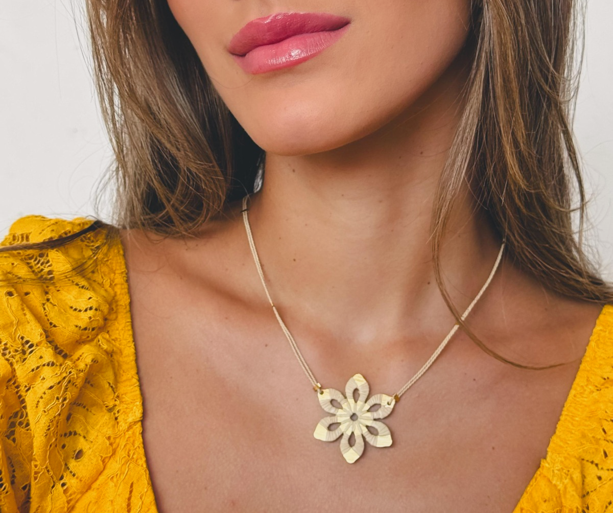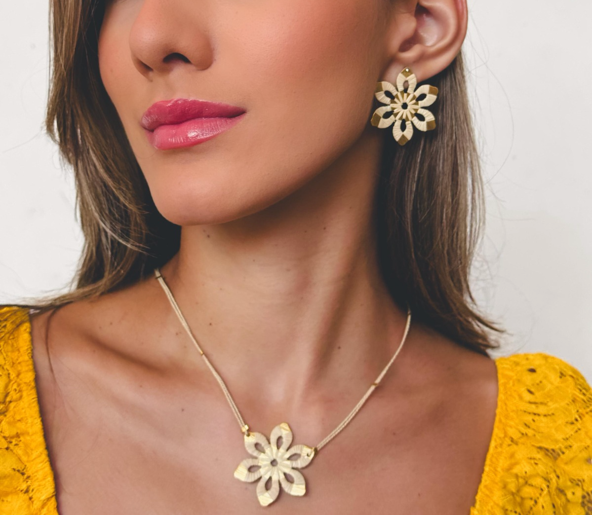 A delicate floral pendant handcrafted from Buriti fiber, shaped into graceful golden petals that catch the light with natural movement. Elegant and lightweight, Verna is a quiet celebration of botanical beauty.